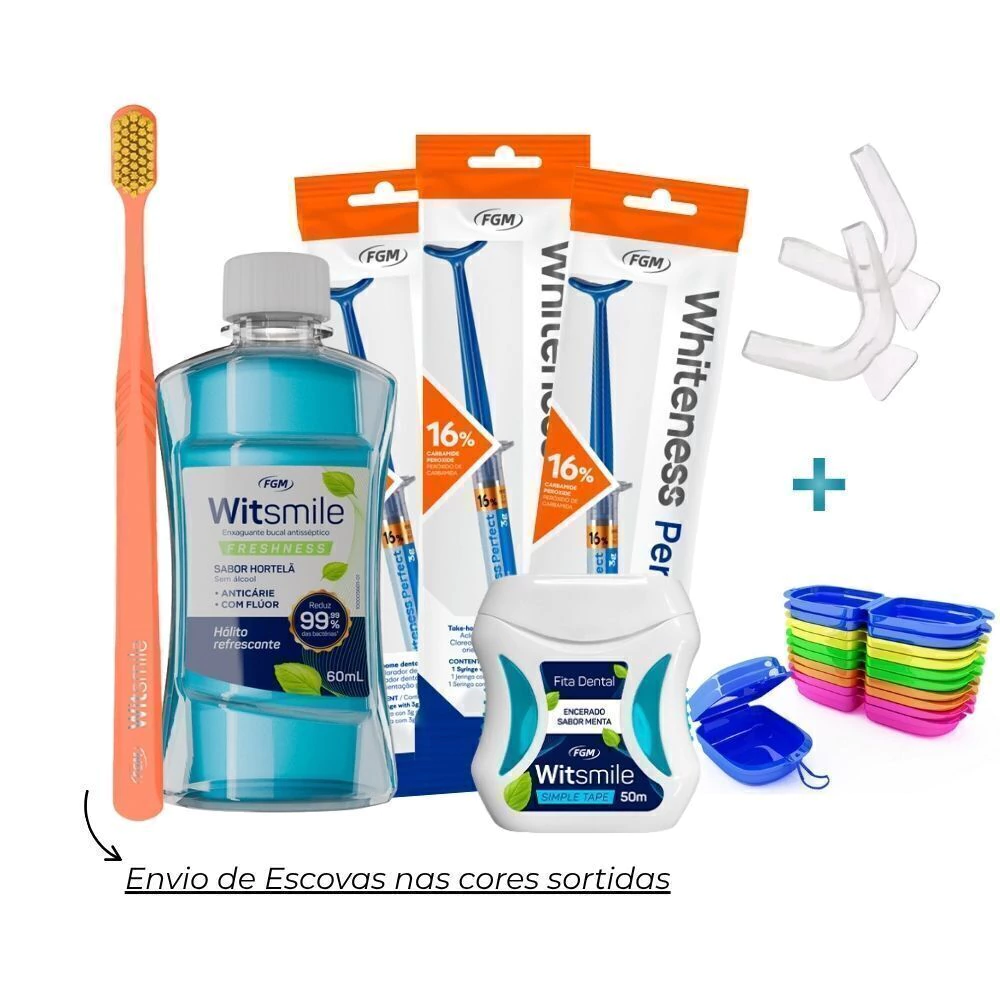 O Kit Clareamento e Higiene Bucal Witsmile + Whiteness Perfect 16% foi desenvolvido para quem busca resultados eficazes e segurança durante o clareamento dental em casa. Composto por produtos de alta qualidade da FGM, o kit reúne o poder do Whiteness Perfect 16%, que oferece clareamento gradual e controlado, e itens da linha Witsmile, que garantem uma rotina completa de higiene bucal com frescor e conforto.
