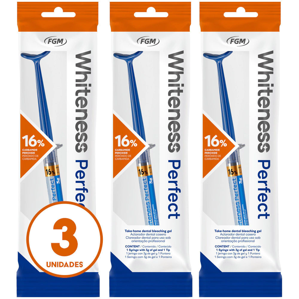 01- Mini Kit Clareador Dental Whiteness Perfect 16% FGM (3 Seringas): gel de peróxido de carbamida 16% com agentes dessensibilizantes, pH neutro e alta estabilidade para um clareamento gradual e eficaz.