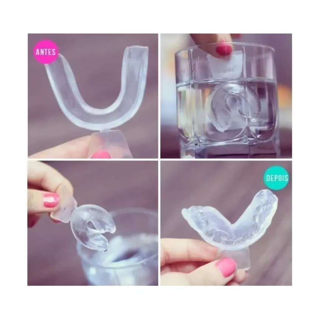 Mergulhe uma moldeira na água quente por 10 a 15 segundos, até que fique maleável. Posicione imediatamente sobre os dentes, pressionando com os dedos e a língua. Após moldar, mergulhe em água fria para fixar o formato.