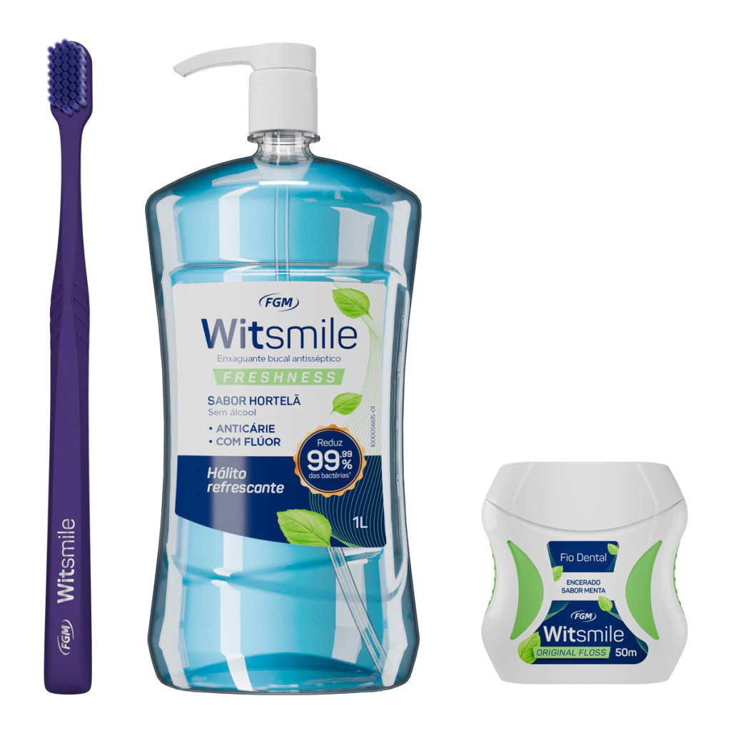 O Kit de Higiene Bucal Witsmile Completo da FGM foi desenvolvido para quem busca uma rotina prática e eficiente de cuidados com a saúde bucal. Ele reúne três produtos essenciais – escova dental, fio dental e enxaguante bucal – que atuam de forma complementar para promover limpeza profunda, prevenção contra cáries e gengivites, além de garantir hálito fresco por muito mais tempo.