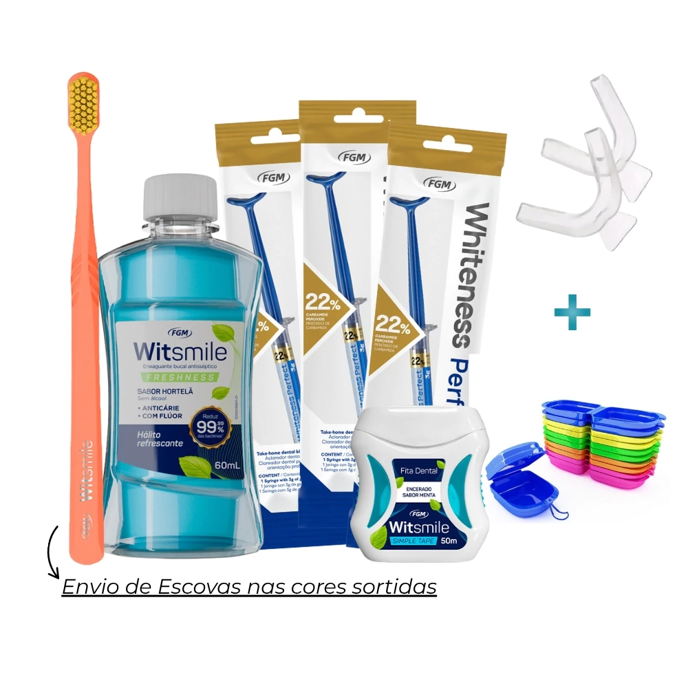 O Kit Clareamento e Higiene Bucal Witsmile + Whiteness Perfect 22% foi desenvolvido para quem busca praticidade, estética e resultados profissionais no cuidado com o sorriso. Composto por produtos de alta qualidade da FGM, este kit combina o poder do clareamento dental com itens essenciais de higiene bucal, oferecendo uma solução completa para dentes mais brancos, hálito refrescante e saúde oral impecável.